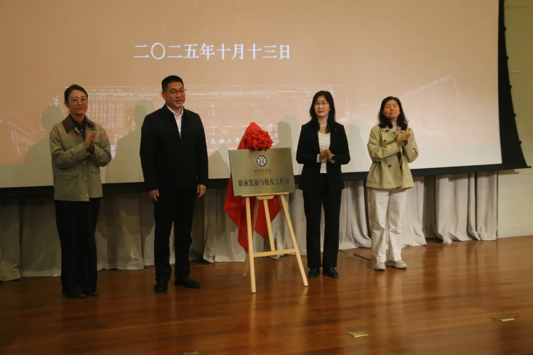 为进一步整合校友资源、深化就业育人,国际商学院成立“职业发展与校友工作室”。邹雷处长、李旻院长、刘雨涵老师、邵翠莲老师共同为国际商学院“职业发展与校友工作室”揭牌。