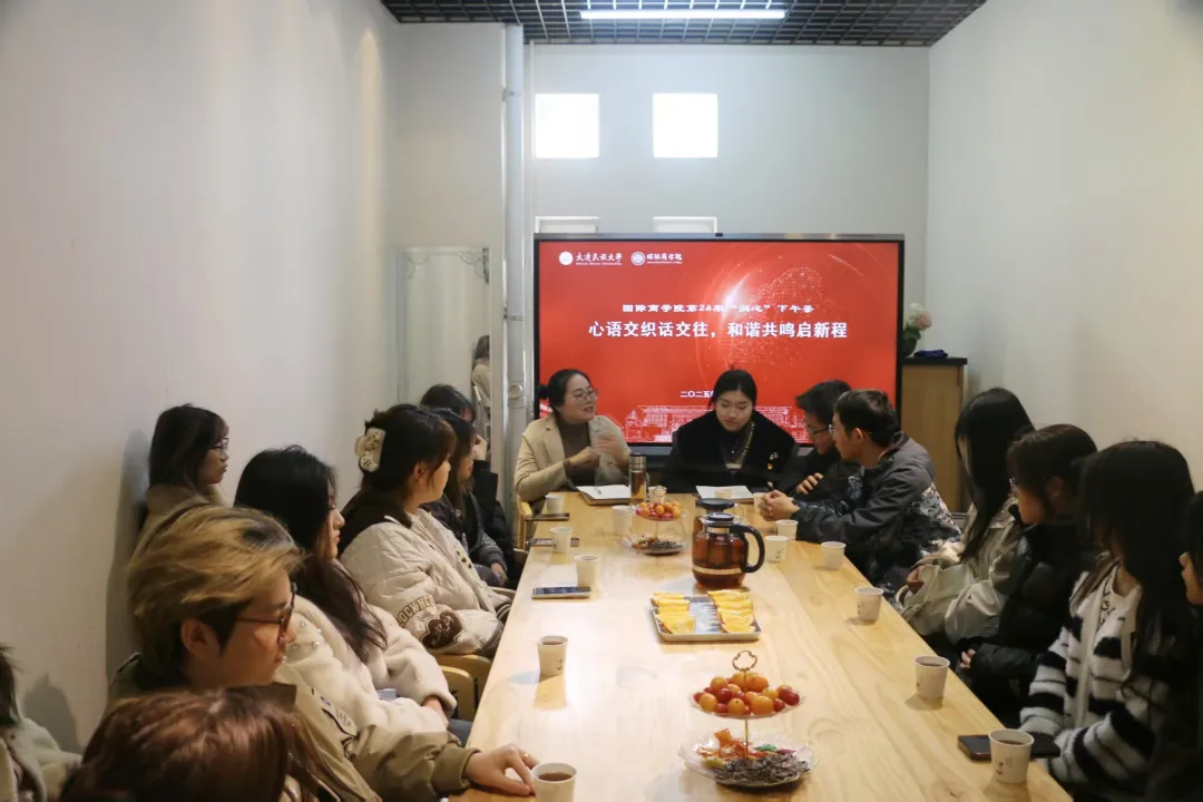 进一步贯彻落实“三全育人”教育理念,构建完善的心理健康教育工作体系,通过师生交流引导学生识别负面情绪、重视自身和他人心理健康、掌握心理危机应对技巧,凝聚呵护大学生心理健康的坚实力量,学院于3月14日开展2025年第一期“润心”下午茶,本期主题为“心语交织话交往,和谐共鸣启新程”。学院党委副书记刘君、辅导员刘芷卉及14名大一同学参会。