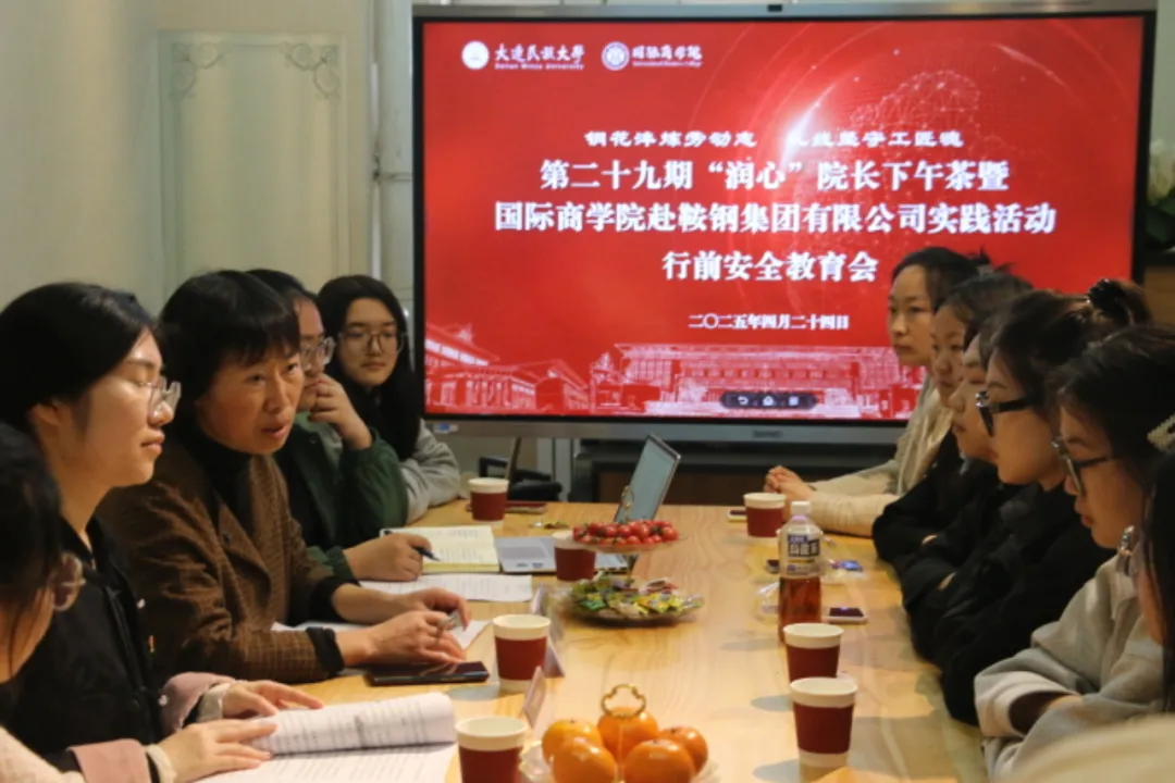 为认真贯彻落实习近平总书记在全国民族团结进步表彰大会、全国教育大会以及在辽宁考察时的重要讲话和重要指示精神,以铸牢中华民族共同体意识为主线,结合学校服务新时代东北全面振兴行动方案,发挥鞍山作为“共和国工业奠基地”的育人作用,国际商学院于4月24日在闻道楼119开展2025年第四期“润心”下午茶暨国际商学院赴鞍钢集团有限公司实践活动行前安全教育会,国际商学院党委书记高强、实践团队教师代表及全体学生参加活动。活动由实践团队学生负责人李承曦主持。