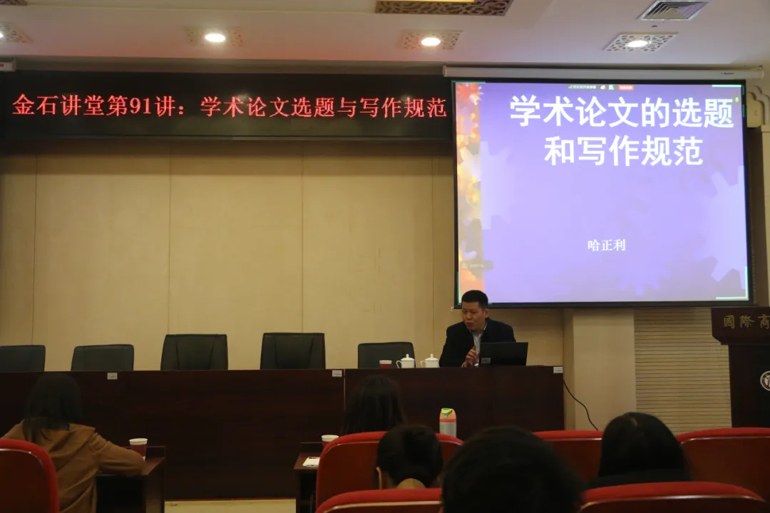 10月20日,国际商学院于闻道楼103开展第91讲“金石讲堂”,本次讲堂邀请大连民族大学党委常委、副校长哈正利以《学术论文选题与写作规范》为题作报告。讲堂由国际商学院院长李旻主持,学院教师参加。